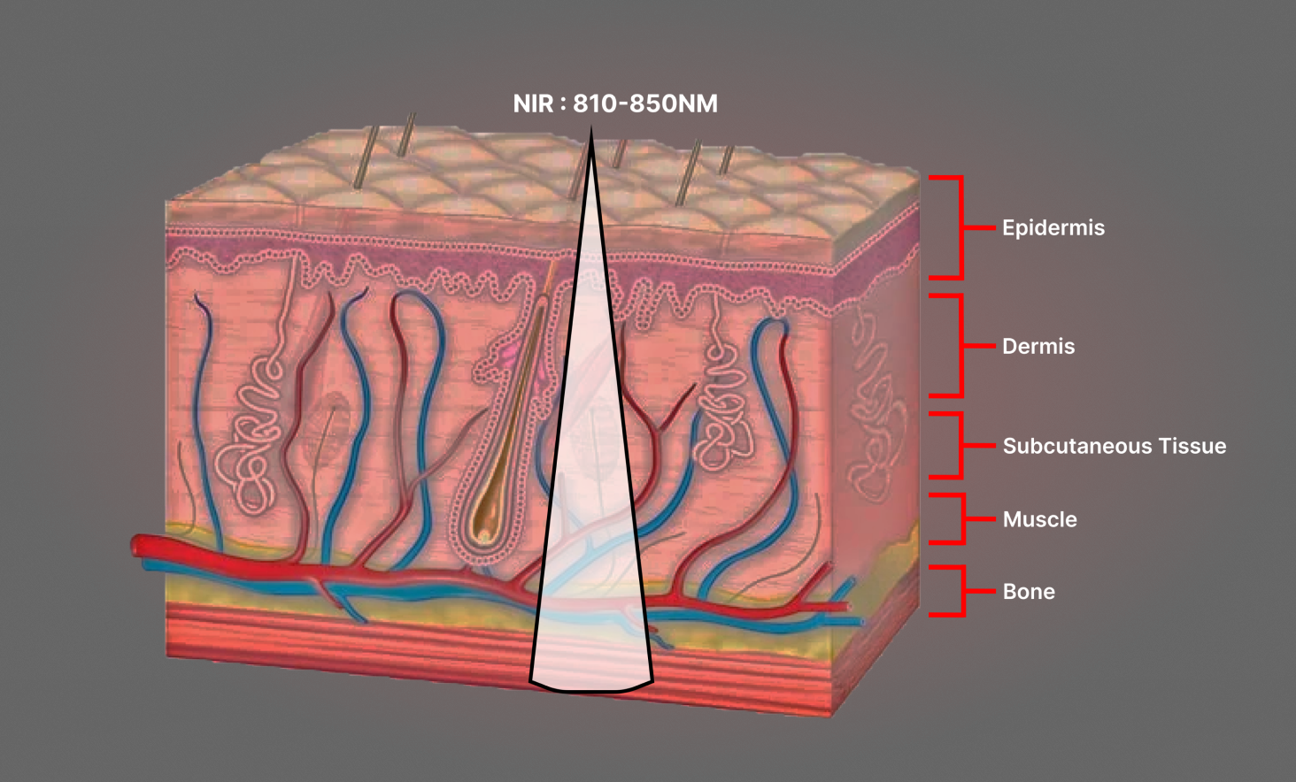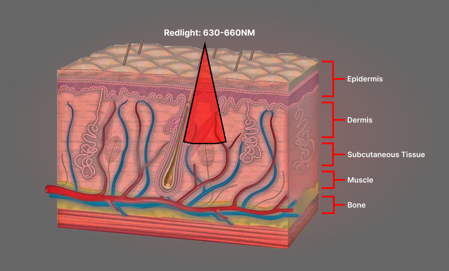 RedLight är från 630-660NM, penetrerar till Dermis och riktar sig mot en mängd problem i huden